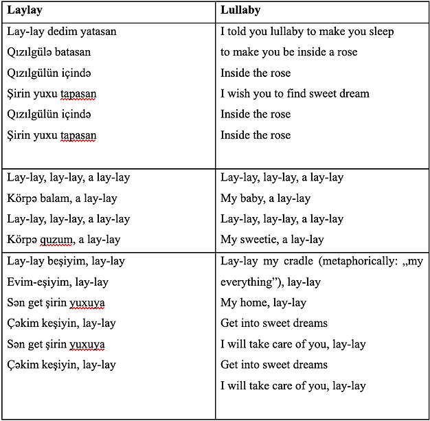 Lullabies are songs sung by mothers on the cradle with special rhythm and harmony and therefore it is sometimes called as cradle songs, too. Love of mother to baby, her wishes and desires related to child are sounded in one poetic language. Lullabies consist of four hemistiches mostly. Lullabies are one of the most popular genres in Azerbaijan. They are the songs that have been sung to put babies to the bed and to fondle them. In this lullaby, mother expresses her feelings toward her child by imagining her child among the roses with sweet dream. Besides, the mother indicates how she will take care of her child while the baby is sleeping.